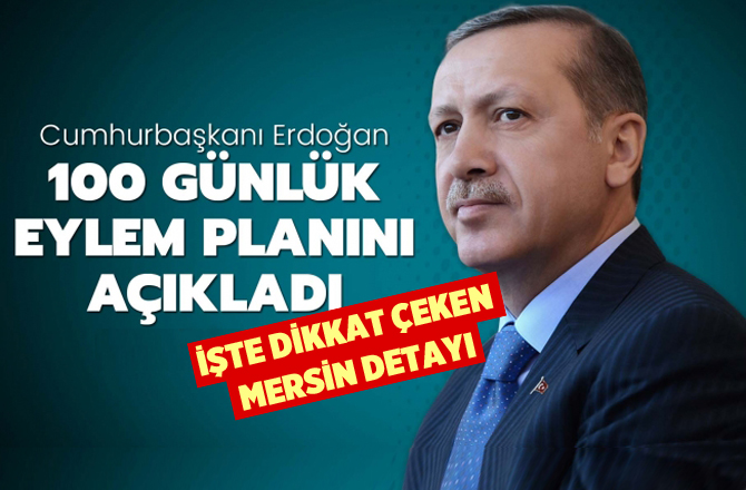 Cumhurbaşkanı Recep Tayyip Erdoğan, hükümetin ilk 100 gün içinde hayata geçireceği projeleri açıkladı. Açıklamada Mersin’i de yakından ilgilendiren projeler tek tek paylaşıldı. İşte açıklanan 400 proje içinde yer alan Mersin detayı…