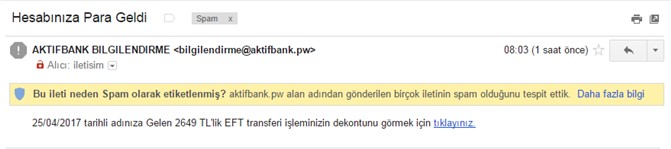 Bilişim ve Yazılım Uzmanları, "son günlerde artan bahse konu sahte mail "aktifbank.pw" alan adı üzerinden gönderildiği bildirilirken, gelen mail de "25/04/2017 tarihli adınıza Gelen 2649 TL'lik EFT transferi işleminizin dekontunu görmek için tıklayınız." şeklinde üzerine tıklanılabilir link içeren yazı bulunuyor. Mailin içinde yer alan linke kesinlikle tıklanmaması gerekiyor. Sahte maillerin hedefi şirketlere ait kurumsal mail hesapları olduğu gibi, normal kullanıcı mail adreslerine de kimlik avı amacıyla mailler gönderiliyor. Hergeçen gün yeni yöntemlerle internet ortamında bilgi hırsızlığı devam ediyor." dediler.