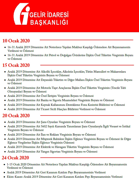 Gelir İdaresi Başkanlığı, mükelleflerin vergisel yükümlülüklerini, beyan ve ödeme dönemlerini kolayca takip edebilmeleri amacıyla hazırlanan “2020 Yılı Vergi Takvimi” internet ortamında kullanıma sundu.
