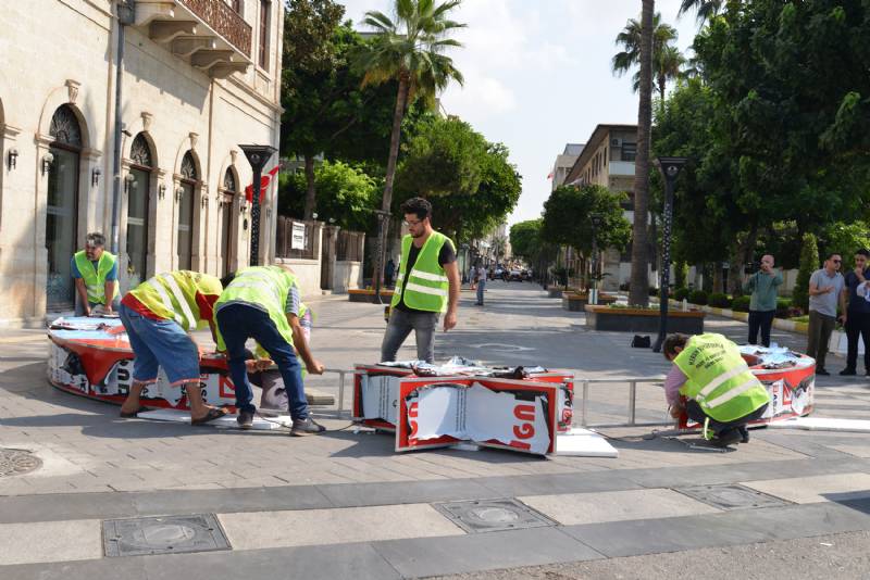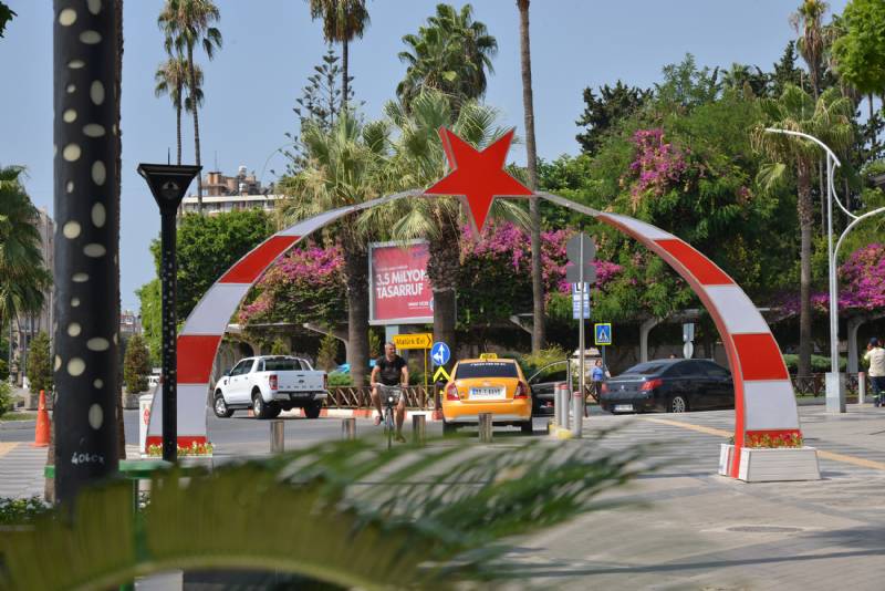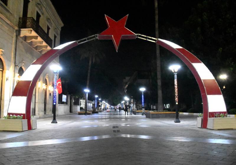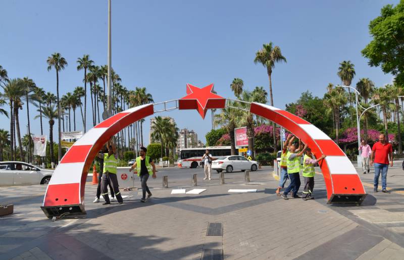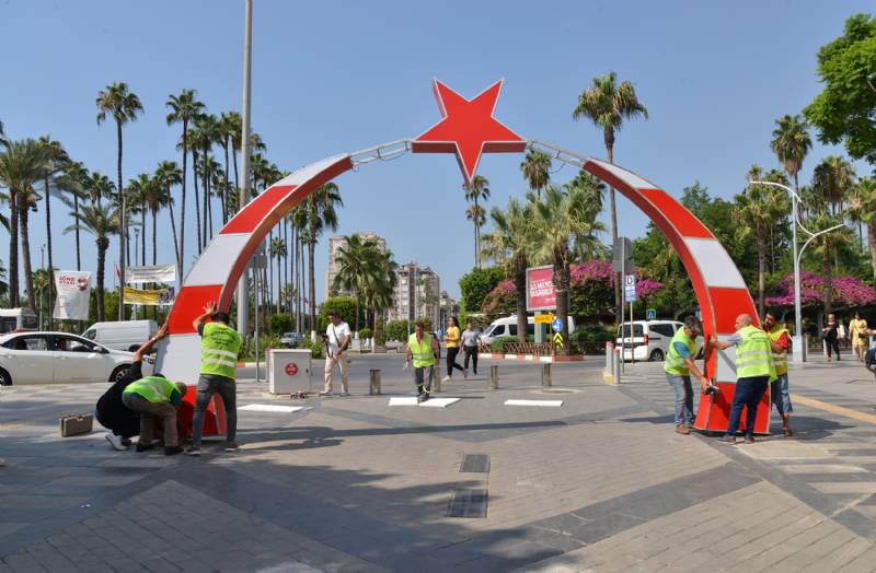 Mersin Büyükşehir Belediyesi tarafından kentsel tasarım çalışmaları kapsamında Atatürk Caddesi girişine yapılan Ayyıldızlı tak yenilendi.