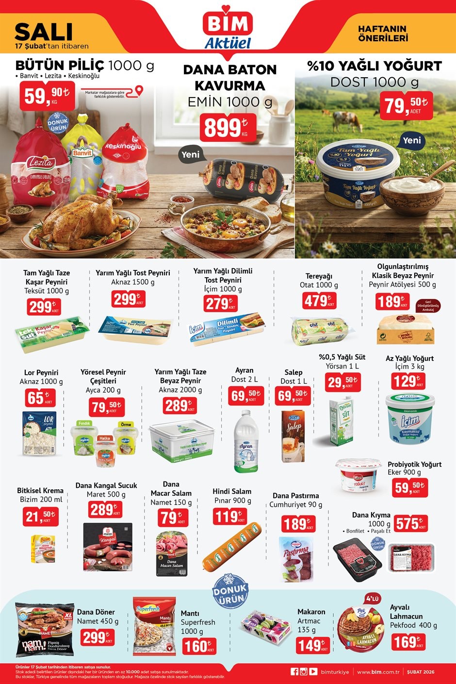 BİM mağazaları, 17 Şubat Salı gününden itibaren geçerli olacak "Haftanın Önerileri" kataloğu ile mutfakların protein ihtiyacını karşılayacak geniş kapsamlı bir indirim listesi sunuyor. Bütün piliçten dana kıymaya, kahvaltılık peynir çeşitlerinden pratik dondurulmuş gıdalara kadar pek çok ürün avantajlı fiyatlarla raflardaki yerini alıyor.