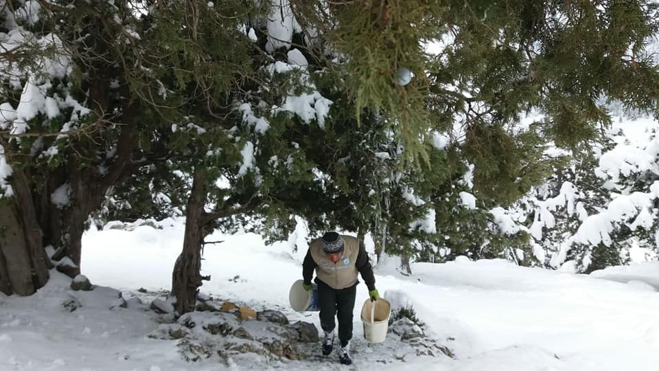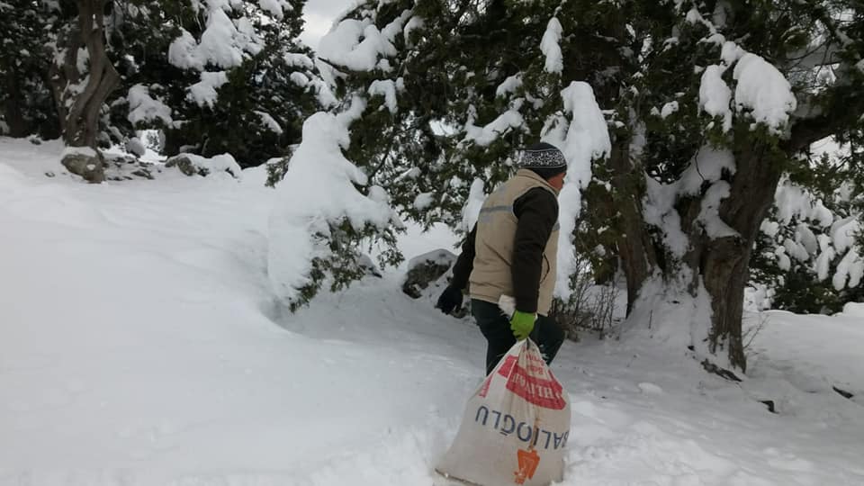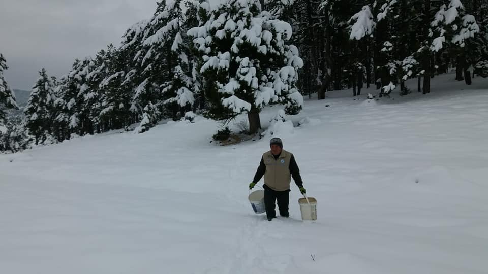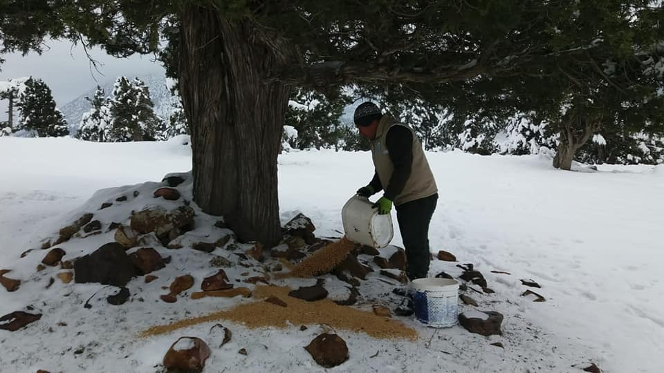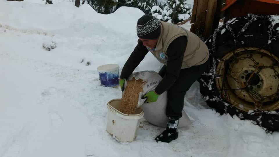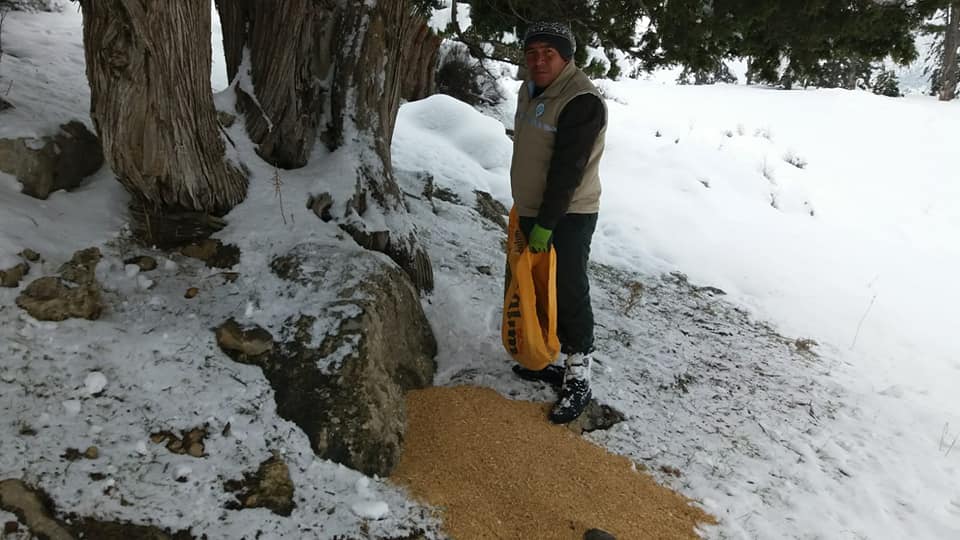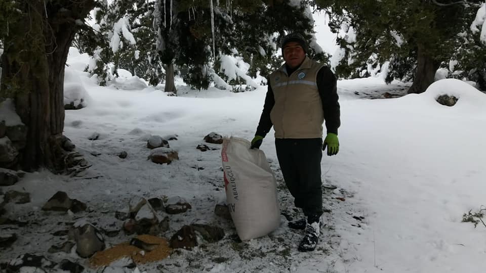Kar yağışlarının ardından yaban hayatta soğuk ve kar nedeniyle yiyecek sıkıntısı çeken kuşlar için Doğa Koruma ve Milli Parklar Genel Müdürlüğü ekipleri tarafından çuvallarla doğaya yem bırakıldı.
