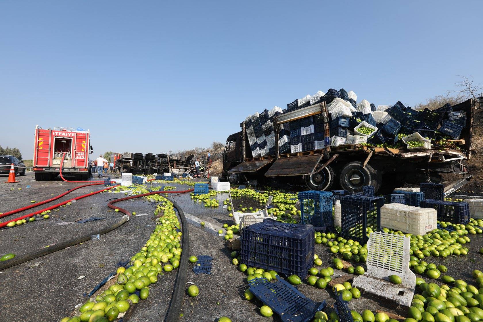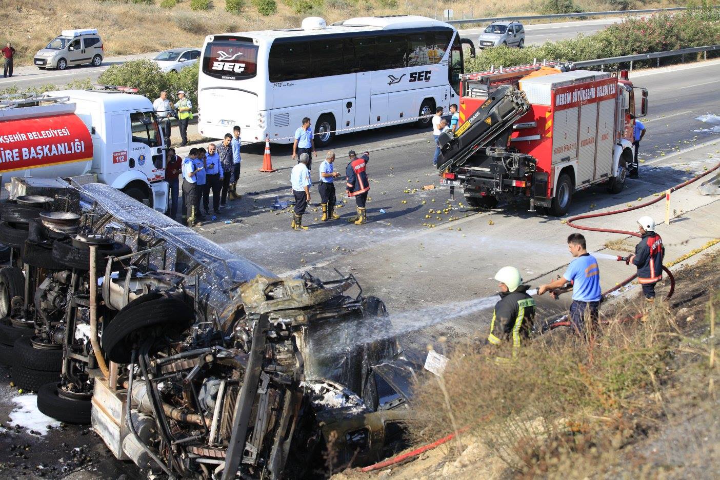 Mersin - Adana istikametinde seyir halinde bulunan akaryakıt yüklü tanker ile limon yüklü kamyonun kaza yapması sonucu can pazarı yaşandı. Araç içerisinde yaralı olarak çıkarılan sürücüler hastaneye kaldırılırken, araçlar alev aldı. Mersin İtfaiyesinde çok sayıda ekibin müdahalede bulunduğu yangında olası bir başka facianın önüne geçildi.