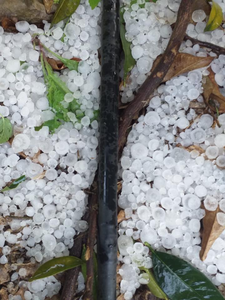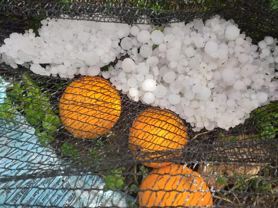 Ceviz büyüklüğündeki dolu nedeniyle Narenciye bahçeleri büyük hasar gördü, ağaç üzerindeki portakallar yerlere dökülürken, bir çoğu da dalında parçalandı.