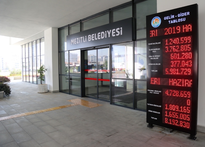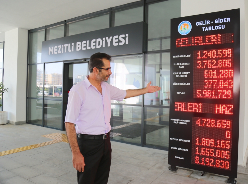 Şeffaf yönetim anlayışıyla büyük beğeni kazanan Mezitli Belediye Başkanı Neşet Tarhan, daha önce 8 farklı noktada bulunan LED ışıklı gelir gider panosunu yeni belediye binasının önüne de yerleştirdi.