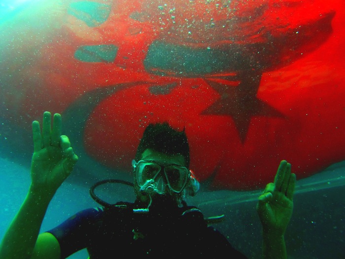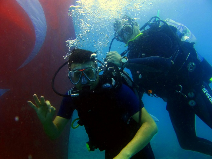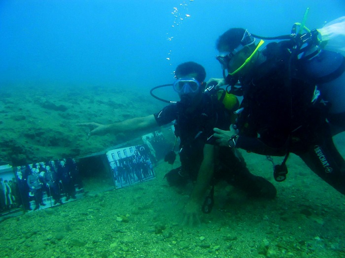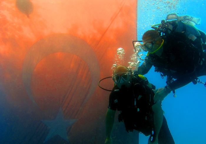 Mavinin derinliklerine dalış yapan engelli bireyler, su altında yer alan ve Mersin’de ilk defa gerçekleştirilen 29 Ekim Cumhuriyet Bayramı ve Atatürk fotoğrafları sergisini gezdiler. Dalış, 29 Ekim’e özel hazırlanan 29 metrekarelik Türk Bayrağının suyun yüzeyinde açılması ile başladı.