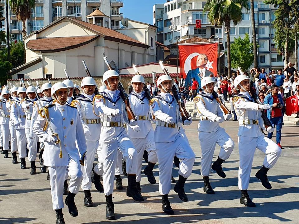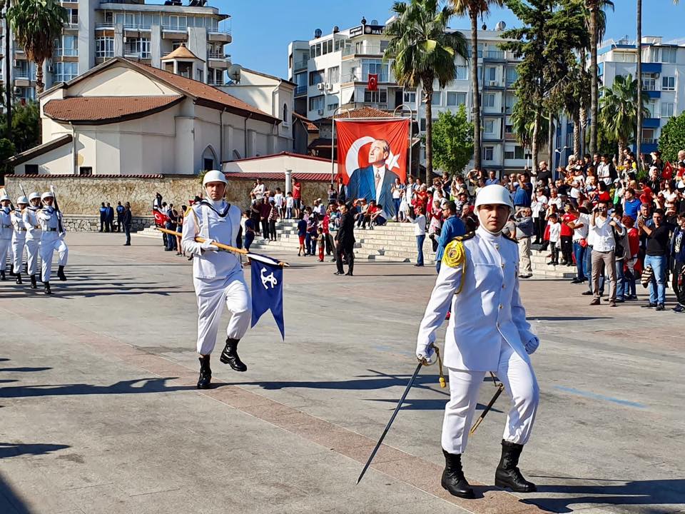 Tören, Akdeniz Bölge ve Garnizon Komutanlığı Bandosu eşliğinde saygı duruşu ve İstiklal Marşı eşliğinde Türk bayrağının göndere çekilmesiyle sona erdi.