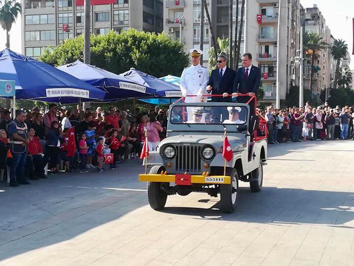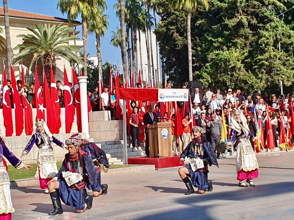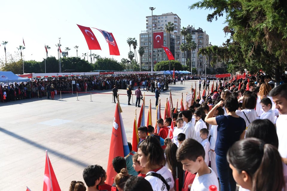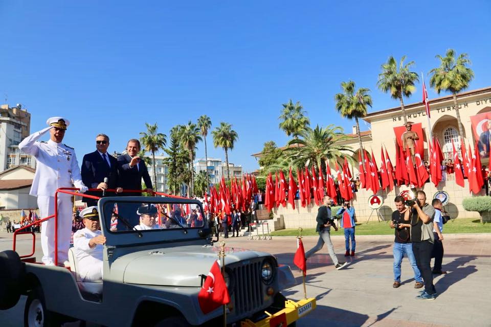 Cumhuriyet Meydanı'nda düzenlenen törene, Mersin Valisi Ali İhsan Su, Akdeniz Bölge ve Garnizon Komutanı Tuğamiral Ercan Kireçtepe ve Mersin Büyükşehir Belediye Başkanı Vahap Seçer, milletvekilleri, belediye başkanları protokol üyeleri, askeri erkan, gaziler ve öğrenciler katıldı. Tören, Vali Su'nun askeri tören mangasını selamlamasıyla başladı.