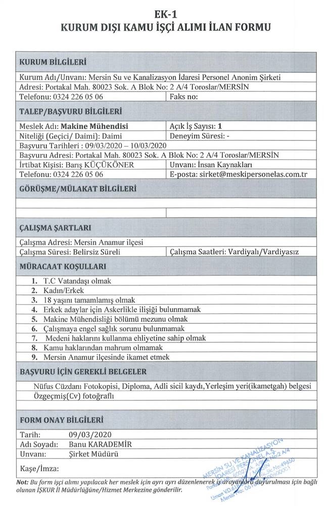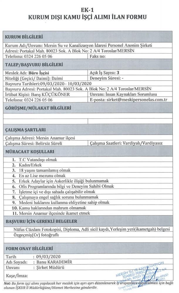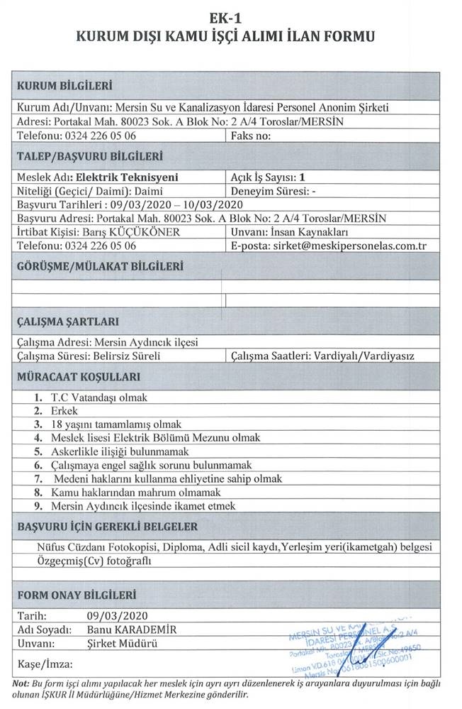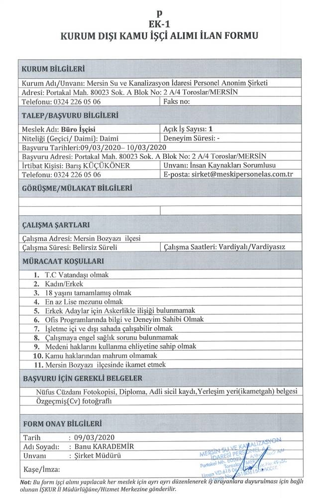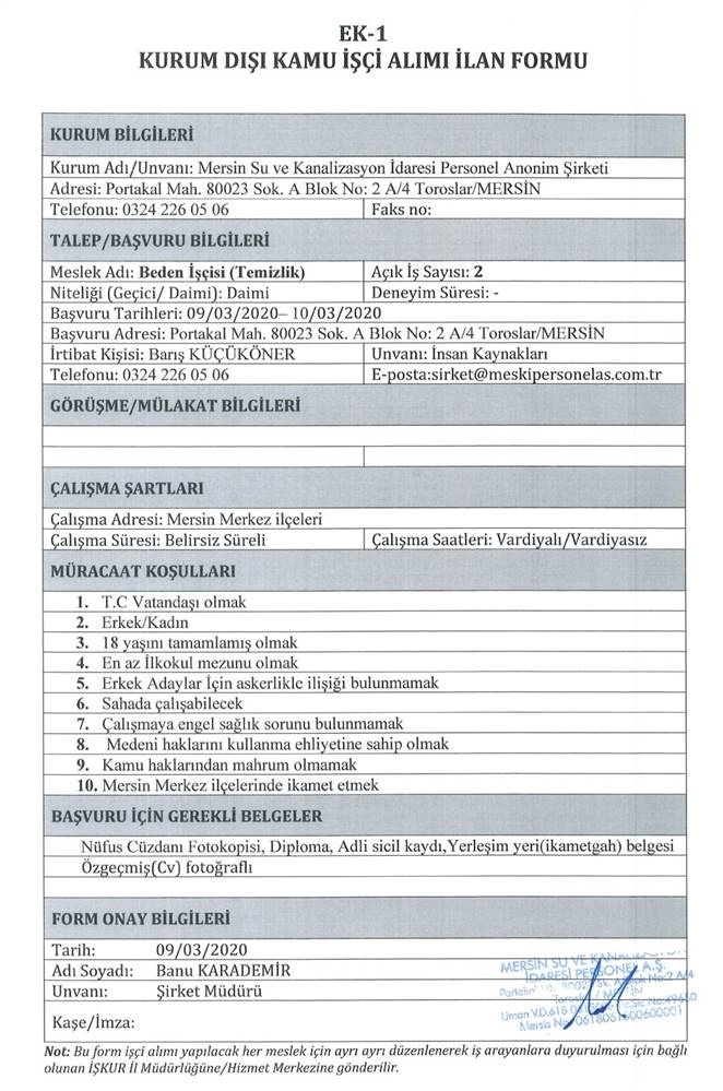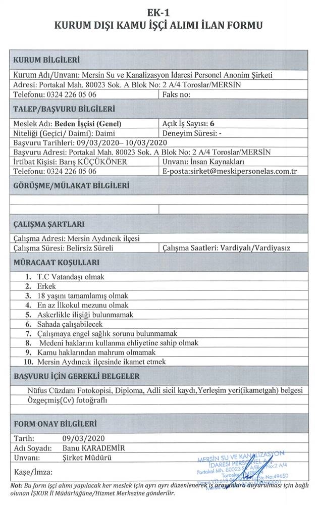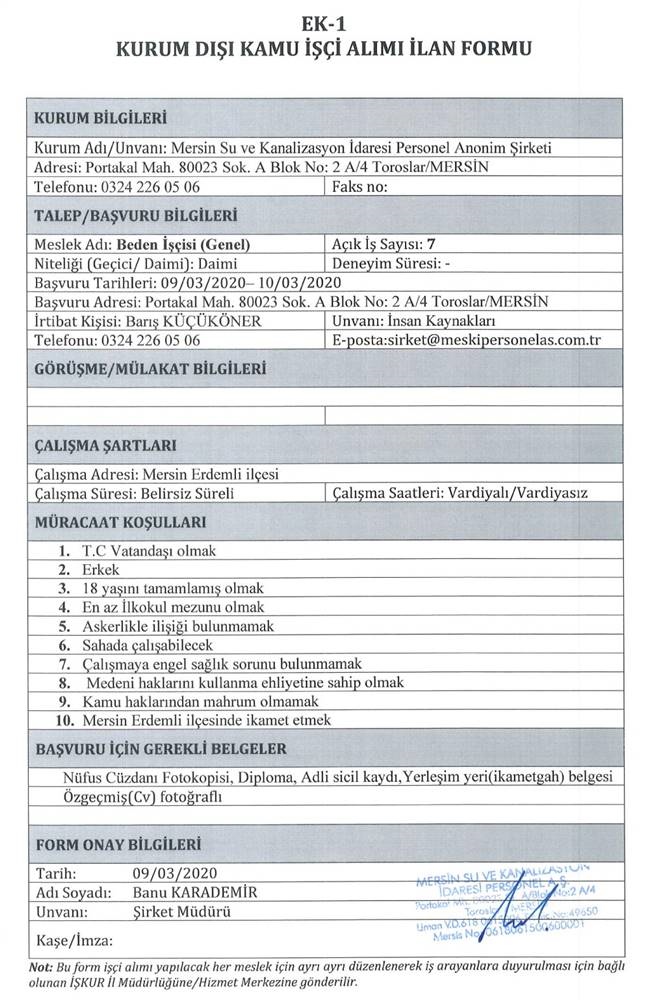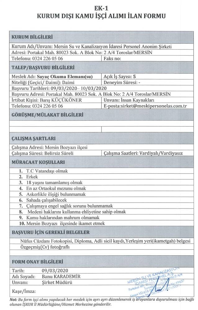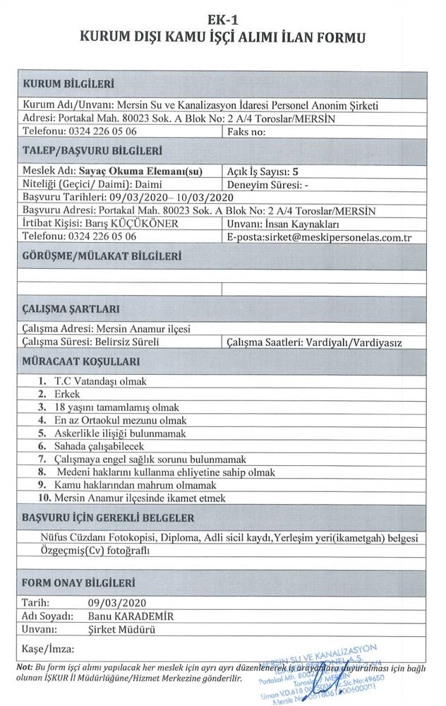 Mersin Su ve Kanalizasyon İşleri İdaresi Personel A.Ş çok sayıda personel alacağını duyurdu. Farklı pozisyonlarda çalıştırılmak üzere toplamda 62 personelin alınacağının duyurulduğu İlan İŞKUR resmi sitesinde, ıslak imzalı taranmış evraklarla duyuruldu.