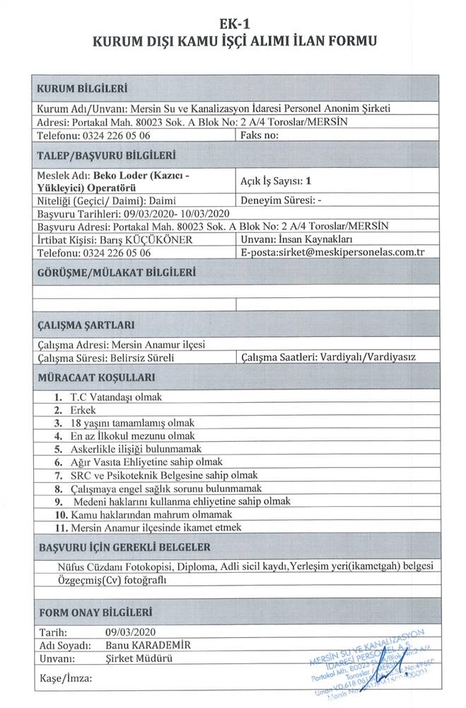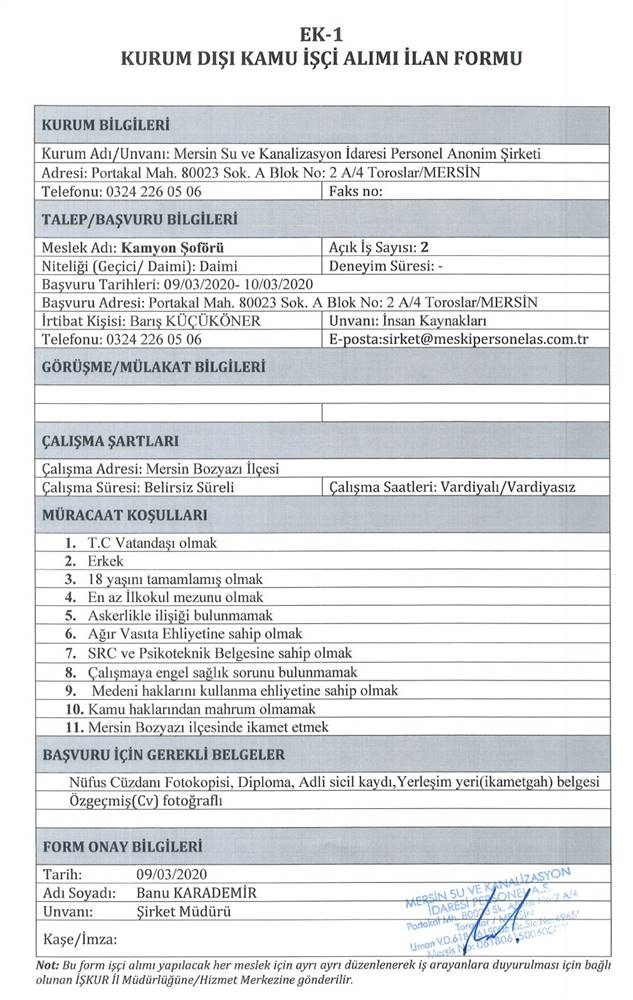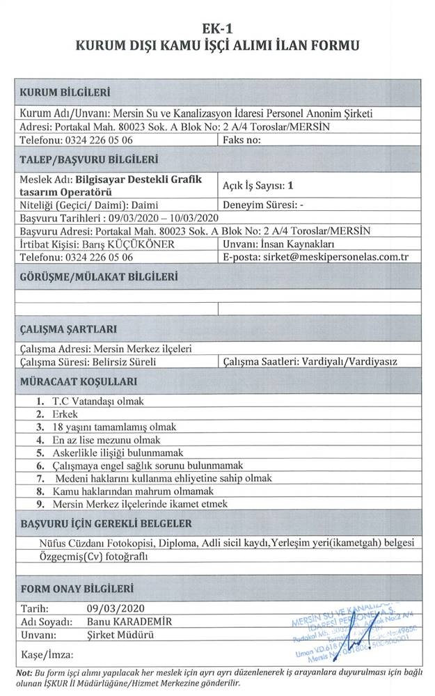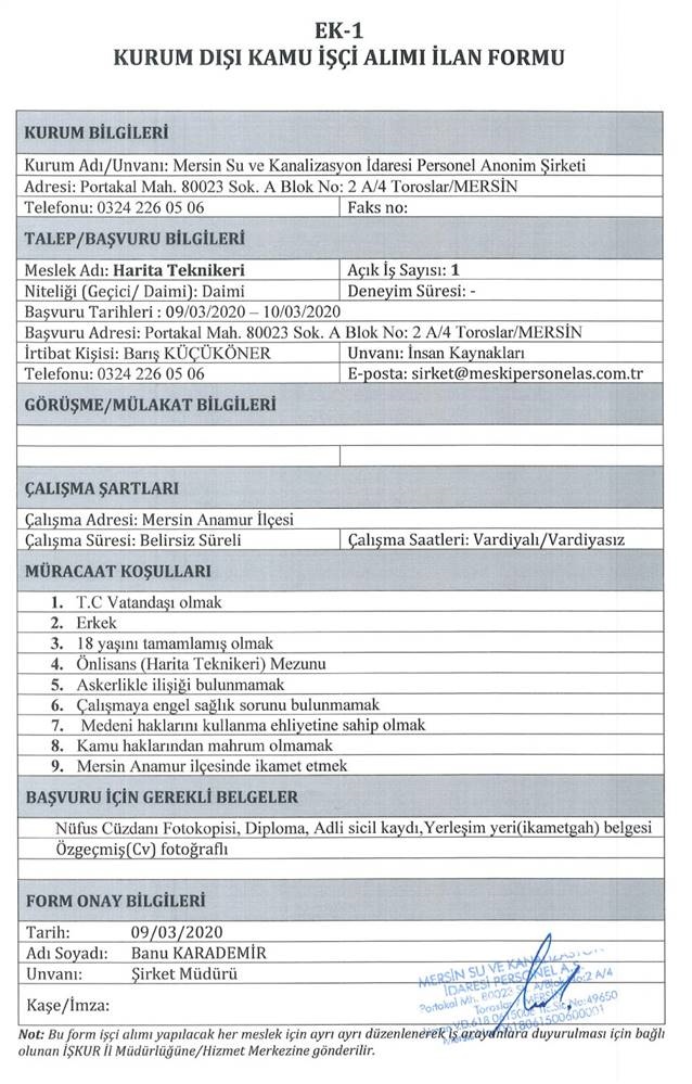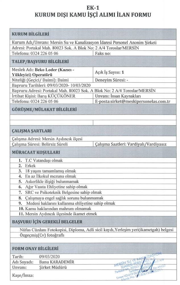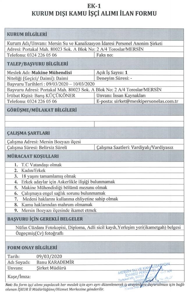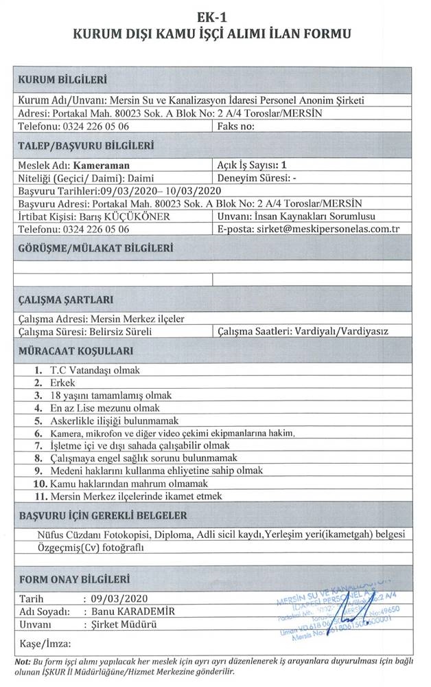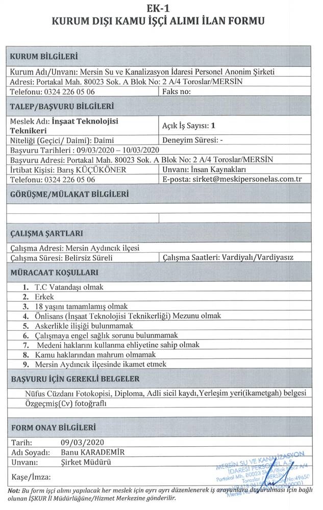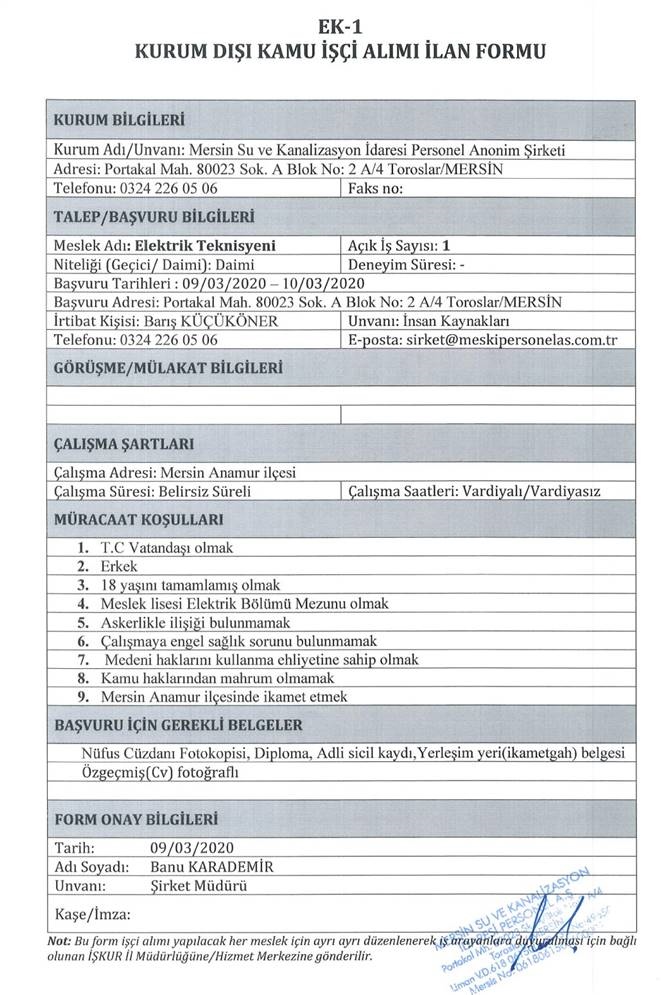 Mersin Su ve Kanalizasyon İşleri İdaresi Personel A.Ş çok sayıda personel alacağını duyurdu. Farklı pozisyonlarda çalıştırılmak üzere toplamda 62 personelin alınacağının duyurulduğu İlan İŞKUR resmi sitesinde, ıslak imzalı taranmış evraklarla duyuruldu.