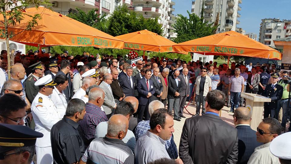 Diyarbakır'ın merkez Sur İlçesi'nde hendek kapatan güvenlikg üçlerine PKK'lı teröristlerin roketatar ve bombalı saldırısında şehit olan polis memuru 23 yaşındaki Cem Tayfun, memleketi Mersin'in Erdemli İlçesi'nde düzenlenen törenle toprağa verildi.