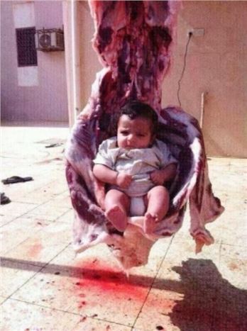 Sosyal paylaşım sitesinde yer alan, kurbanın salıncak yapılıp içine bebeğin oturtulduğu fotoğraf tepki çekti.Kurban Bayramı'nda çekilen ilginç fotoğrafları sosyal medya kullanıcıları facebook ve twitter hesaplarından paylaşmaya başladı. En ilginç fotoğraf ise kesilen bir kurbanı yüzmek için astıktan sonra salıncak yapıp bebeği oturttukları oldu. Bebeği kanlar içindeki hayvanı kestikten sonra içine oturtmaları sosyal paylaşımcılar tarafından tepki çekti. Bir kullanıcı fotoğrafı paylaşıp, "Tiksiniyorum böyle fotoğraflar paylaşılmasından ama bu ne arkadaş ya biri bana açıklasın lütfen yalvarırım" diye tepkisini dile getirdi.