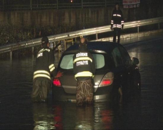 Edirne'de gün boyu aralıklarla süren yağış hayatı olumsuz etkiledi. Yollar göle döndü, araçlar yolda mahsur kaldı.Edirne'de sabah saatlerinde itibaren aralıklarla süren ve zaman zaman şiddetini arttıran sağanak yağmur nedeniyle birçok cadde ve sokak göle dönerken, içerisinde yaşlı ve çocuklarında bulunduğu araçlar, yolda mahsur kaldı. Edirne Otogar'ı çıkışında bulunan köprü alt geçitte biriken yağmur suları adeta göle döndü, araçlar yolda 2 saat boyunca mahsur kaldı.Aracıyla sudan geçmeye çalıştığını ancak bir anda otomobilin durması sonucu su da mahsur kaldıklarını söyleyen Gülden Uslu, ?Yaklaşık 3 saattir burada bekliyorum. Tam suyun içerisinden geçerken araç su da kaldı. Çekiciği çağırdım ancak 2 saat boyunca gelmedi. Aracım daha da fazla su aldı ve çalışmıyor? dedi. Uslu'nun yanında bulunan yaşlı kadın ise ?Böyle rezillik olur mu? Yıllardan beri bunların hiç mi kolayı yok? Hiç mi çaresi yok? İki saat suyun içinde durduk ve çok korktuk? ifadelerini kullandı.Araçlar olay yerine gelen itfaiye ekiplerinin yardımıyla mahsur kaldıkları suyun içerisinden çıkartıldı. Yoğun yağmur sularının biriktiği yol da şerit çekilerek trafiğe kapatıldı.Edirne Meteoroloji Müdürlüğü yetkililerinden yapılan açıklamada, gece boyunca aralıklarla devam etmesi beklenen yağmur yağışı nedeniyle vatandaşların sel ve su baskınlarına karşı duyarlı olunması istendi.