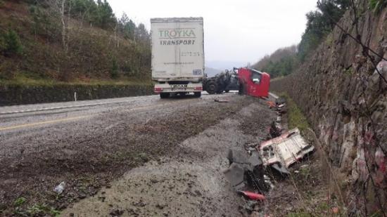 Zonguldak'ın Kdz.Ereğli ilçesinde kontrolden çıkan TIR'ın istinat duvarına çarpması sonucu meydana gelen trafik kazasında 1 kişi yaralandı.Edinilen bilgiye göre kaza, Zonguldak-Ereğli karayolu Delihakkı Soğanlı Rampaları mevkisi 38. kilometrede meydana geldi. Zonguldak'tan Kdz. Ereğli ilçesine seyir halinde olan Burhan A. (34) yönetimindeki, 34 EY 9691 plakalı TIR, sürücüsünün direksiyon hakimiyetini kaybetmesi sonucu, yol kenarındaki istinat duvarına da çarparak devrildi. Kazayı gören diğer araç sürücülerinin yardımıyla araçtan yaralı olarak çıkartılan Burhan A., olay yerine gelen sağlık ekipleri tarafından yapılan ilk müdahalenin ardından Kdz. Ereğli Devlet Hastanesi'ne kaldırıldı.Öte yandan, yolun orta kısmında kalan dorse nedeniyle trafik kontrollü olarak bir müddet tek şeritten verildi. TIR'ın kaza yapmasına ise, solama yaparak karşı şeritten ilerleyen ve plakası alınamayan bir otomobilin neden olduğu ileri sürüldü.Yaralının sağlık durumunun iyi olduğu hayati tehlikesinin bulunmadığı öğrenilirken kazayla soruşturmanın sürdüğü belirtildi.