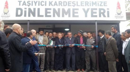 Kahramanmaraş Onikişubat Belediyesi tarafından Mahrukatçılar Çarşısında hizmet veren taşıyıcı işçiler için yapılan dinlenme noktası hizmete sunuldu.Onikişubat Belediyesi, toplumun her kesimine hizmet götürmeye çalışıyor. Bu bağlamda Mahrukatçılar Çarşısı içerisinde taşıma işlerinde çalışan işçiler için dinlenme noktası oluşturuldu. İşçilerin, kış mevsimi boyunca soğuk ve yağışlı havalarda dinlenip, vakit geçirebilecekleri dinlenme noktası, bu gün Belediye Başkanı Hanefi Mahçiçek tarafından hizmete sunuldu.Açılışta konuşan Başkan Mahçiçek, zor şartlar altında görev yaptığını anımsatarak, ?Bu kardeşlerimiz büyük emek sarf ederek evlerine ekmek götürüyorlar. Gerçekten kazançlarının her kuruşu analarının ak sütü gibi helal. Biz de Onikişubat Belediyesi olarak yıllardır bu kardeşlerimizin bir eksiği olan bu dinlenme tesisini yapalım, kardeşlerimizin rahatça istirahat edebilecekleri bir ortam oluşturalım istedik. Umarım beğenirsiniz. Hayırlı olmasını diliyorum? diye konuştu.Belediye Başkan Yardımcısı Dr. Ali Ünsal ve birim müdürlerinin de katıldığı program, dualar eşliğinde dinlenme noktasının hizmete açılmasıyla son buldu. Başkan Mahçiçek, daha sonra çevre esnaflarıyla muhabbet edip, taleplerini dinledi.