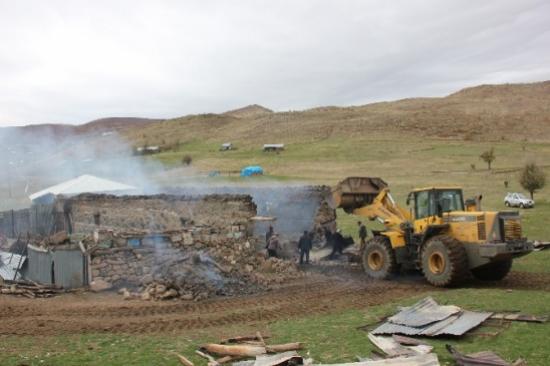 Bingöl'de bir ahırda çıkan yangın, 62 hayvanın telef olmasına sebep oldu. Tek geçim kaynağı olan hayvanların telef olmasıyla mağduriyetini dile getiren yetiştirici, devletten yardım beklediğini söyledi.Bingöl Merkez Sütgölü köyünde hayvancılıkla uğraşan Yasin Er'e ait ahırda sabah saatlerinde yangın çıktı. Sebebi henüz öğrenilemeyen yangında ahır içerisinde bulunan 60 küçükbaş hayvan ve iki at yanarak telef oldu. Sabah saat 05.00 civarında çıkan yangını fark eden Yasin Er (55), köylülere haber vererek yardım istedi. Kovalarla su taşıyarak yangına müdahale etmek isteyen köylülerin çabaları sonuçsuz kaldı. Ahırda meydana gelen çökmeler hayvanları dışarıya çıkarmayı güçleştirince 62 hayvan feci bir şekilde telef oldu. Haber verilmesi üzerine olay yerine gelen jandarma, olay yerinde inceleme yaptıktan sonra olayla ilgili soruşturma başlattı. Yangının ardından köye gelen İl Özel İdaresi ve Sancak Belediyesi'ne bağlı iş makineleri, telef olan hayvanları ahırdan çıkararak önceden kazılan yere gömdü.MAĞDURİYETİNİ DİLE GETİRDİYaşanan olayı anlatan Yasin Er, "Akşam hayvanlarım köylülerin sürüsünden alarak ahıra koydum. İki tane atım vardı onları da getirip içeri bıraktım. Akşam 19.00'da ahırı kapatıp eve gittim. Sabah namazından sonra geldiğimde ahırın üzerinden dumanlar çıkıyordu. O an kimseyi arayamadım, içeri girdim duman ve çökmelerden dolayı tekrar dışarı çıktım. İçeride 60 keçi iki tane at vardı hepsi telef oldu. Mağdurum" diye konuştu.Olayla ilgili soruşturma başlatıldı.