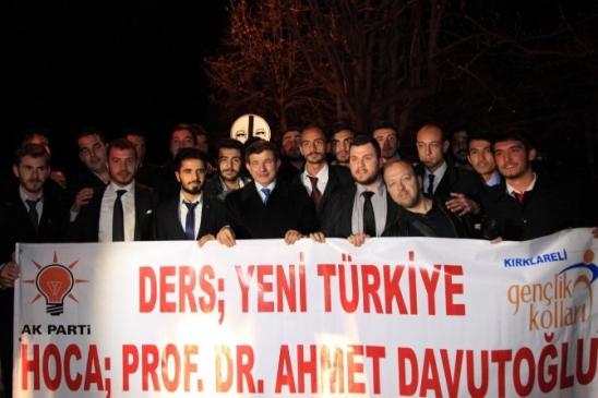 Pankart açarak Başbakan Davutoğlu’na sevgi gösterisinde bulunan AK Parti Kırklareli Gençlik kolları grubu Başbakan Davutoğlu ile fotoğraf çekildi. Pankartta “Ders Yeni Türkiye, Hoca Ahmet Davutoğlu" yazısının arkasına Başbakanı da alarak fotoğraf çektiren partililer başbakanı Kırklareli’den Çorlu’ya uğurladı.