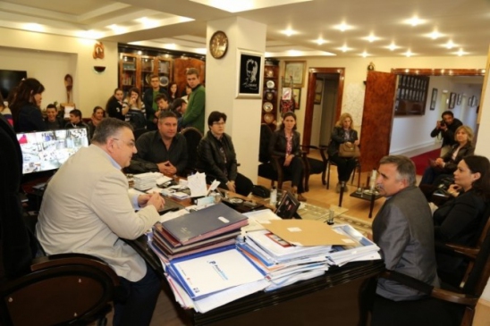 Anadolu Lisesi Müdürü Mustafa Akyüz öncülüğünde Makedonya’dan gelen 6 öğretmen, 20 öğrenci Kırklareli Belediye Başkanı Kesimoğlu ile bir araya geldi. Başkan Kesimoğlu’nu makamında ziyaret eden kardeş okul öğrencileri, çalışmaları hakkında bilgi verdi.