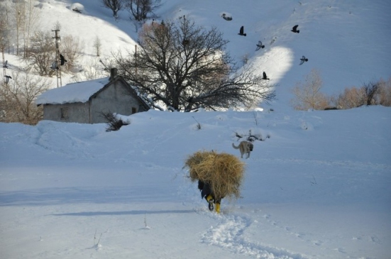 Tunceli’nin Pülümür ilçesinde, belediye ve İl Özel İdaresi tarafından karla mücadele çalışmaları devam ederken, vatandaşlar da yağış nedeniyle çıkaramadıkları hayvanları için ot taşıyor. Pülümür ilçesinde çobanlık yapan Şükrü Kaplan, hayvanlar için yüzlerce metreyi adımlamak zorunda kalıyor.