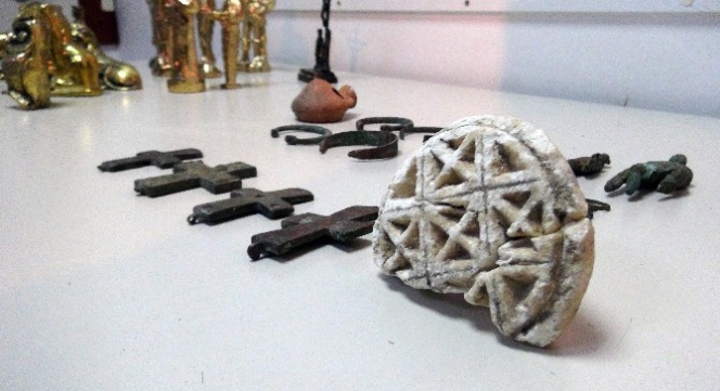 Aksaray’da düzenlenen operasyonda, Bizans dönemine ait 12 heykel ve tarihi niteliği olan 26 eser ele geçirildi.