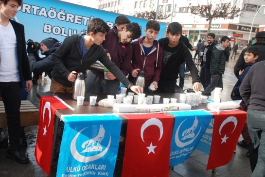Ülkü Ocakları Bolu Şubesi Orta Öğretim Birim Başkanlığı tarafından uyuşturucu madde bonzaiye dikkat çekmek için Cuma namazı sonrasında “Bonzai içme çay iç” sloganıyla camiden çıkan vatandaşlara çay ikram edildi.