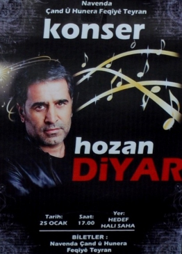 Kürtçe müziğin önemli temsilcilerinden Hozan Diyar, Hakkari Belediyesi Navenda Çand û Hûnera Feqiyê Teyran Kültür Merkezi tarafından düzenlenen sosyal ve kültürel etkinlikler kapsamında 25 Ocak Pazar günü sahne alacak. saat 17.00’de Hedef Halı Saha Tesisleri’nde gerçekleşecek konsere bilet temini sağlanabilmesi için Navenda Çand û Hûnera Feqiyê Teyran Kültür Merkezi çalışanları tarafından Bulvar Caddesi üzerindeki Hakkari Belediyesi hizmet binası önüne bilet satış stantları kuruldu.