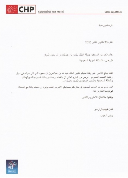 "Ekselansları Salman Bin Abdülaziz el-Suud, Suudi Arabistan Kralı, İki Kutsal Caminin Hizmetkârı, Riyad, Suudi Arabistan Krallığı Ekselansları, Suudluların refahı için hayatını vakfetmiş değerli ağabeyiniz, Kral Abdullah bin Abdülaziz el-Suud’un vefat haberini derin bir üzüntüyle öğrenmiş bulunuyoruz. Merhum Kral Abdullah’a Allah’tan rahmet, size, Suud Hanedanlığı’na ve tüm Suudi Arabistan halkına başsağlığı ve sabırlar diliyor, acınızı yürekten paylaşıyoruz. Cumhuriyet Halk Partisi adına, bu acı gününde Suudi Arabistan’ın yanında yer aldığımızı bilmenizi isteriz."