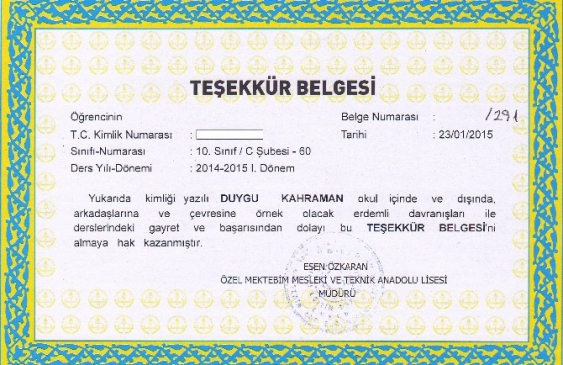Okul yolunda hayatını kaybeden Kahraman’ın Teşekkür Belgesi’nde "Duygu Kahraman, okul içinde ve dışında, arkadaşlarına ve çevresine örnek olacak erdemli davranışları ile derslerindeki gayret ve başarısından dolayı bu Teşekkür Belgesi’ni almaya hak kazanmıştır" denildi.