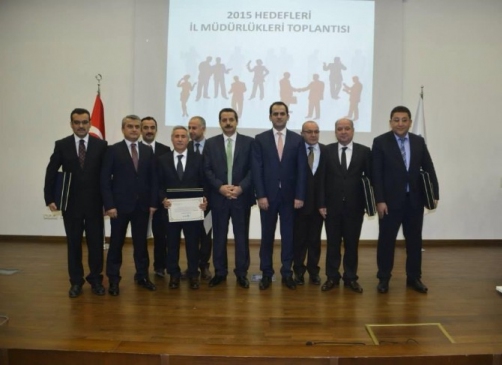 İŞKUR’un Ankara’daki hizmet binasında yapılan Çalışma ve İş Kurumu İl Müdürleri Toplantısı’na Çalışma ve Sosyal Güvenlik Bakanı Faruk Çelik, Genel Müdür Dr. Nusret Yazıcı, Genel Müdür yardımcıları, daire başkanları ve il müdürleri katıldı. 2014 yılında il müdürlüklerinin performansının değerlendirildiği toplantıda 8 grubun birincisi olan çalışma ve iş kurumu il müdürlüklerine plaket verildi. 2014 yılı hedef gerçekleştirme rakamları üzerinden yapılan değerlendirmeye göre 8 grubun birincisi olan İzmir, Sakarya, Aydın, Tokat, Bolu, Karabük, Kırıkkale, Bingöl il müdürlükleri plaketlerini Çalışma ve Sosyal Güvenlik Bakanı Faruk Çelik ile Genel Müdür Dr. Nusret Yazıcı’nın elinden aldı.