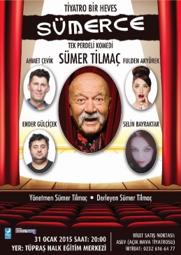 Ünlü komedi oyuncusu Sümer Tilmaç’ın hem oynadığı hem de yönettiği, Ahmet Çevik, Fulden Akyürek, Ender Gülçiçek, Selin Bayraktar gibi sevilen oyuncuların da yer aldığı ‘Sümerce’ adlı oyun, 31 Ocak Cumartesi günü saat 20.00’de Aliağa Tüpraş Halk Eğitim Merkezi’nde sahnelenecek. Tek perdeli komedi Sümerce’de Sümer Tilmaç, sanat yaşamını eğlenceli bir şekilde seyirci ile paylaşıyor. Aliağa Belediyesi kültür ve sanat etkinlikleri kapsamında sahnelenecek oyunun bilet fiyatları 5 TL olarak belirlenirken tiyatroseverler oyunun biletlerini Açıkhava Tiyatrosu bilet satış gişesinden temin edebilecek.