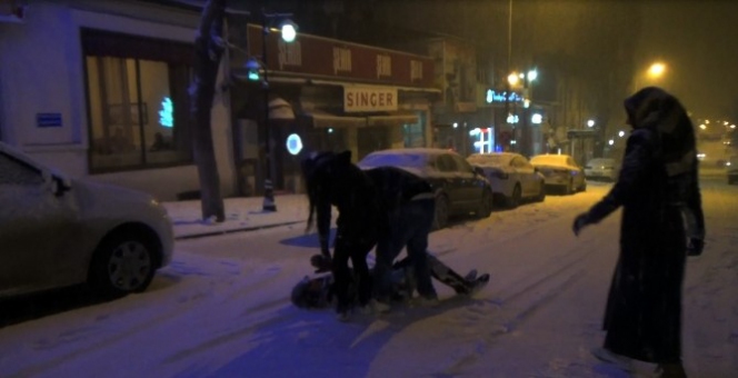 Atatürk Caddesi üzerinde bir araya gelen üniversite öğrencileri ise önce selfie (özçekim) yaptı. Ardından kızlı erkekli kar altında şakalaştı. Kayarak düşen kız öğrenci ise yürekleri ağızlara getirdi. Arkadaşlarının yardımıyla yerden kalkan genç kız daha sonra hiçbir şey olmamış gibi arkadaşlarına kar topu attı.
