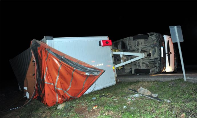 Bursa-Ankara karayolu İnegöl girişinde kuvvetli lodos nedeniyle bir tır devrildi.
