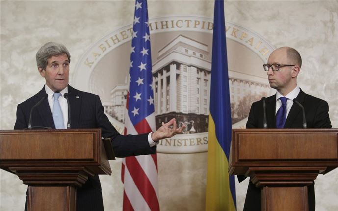 ABD Dışişleri Bakanı John Kerry (sol), Ukrayna'daki temasları çerçevesinde Ukrayna Başbakanı Arseniy Yatsenyuk (sağ) ile bir araya geldi. Basına kapalı olarak gerçekleştirilen görüşmelerin ardından, Kerry ve Yatsenyuk ortak basın toplantısı düzenledi.Muhabir: Anatoliy Stepanov