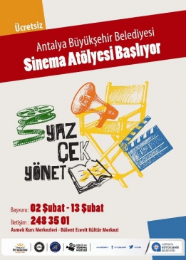 Antalya Büyükşehir Belediyesi Kültür ve Sosyal İşler Dairesi Başkanlığı, Akdeniz Üniversitesi İletişim Fakültesi işbirliğiyle ‘Sinema Atölyesi’ düzenliyor. Sinema Atölyesi’ne son başvuru tarihi 13 Şubat olarak açıklandı.