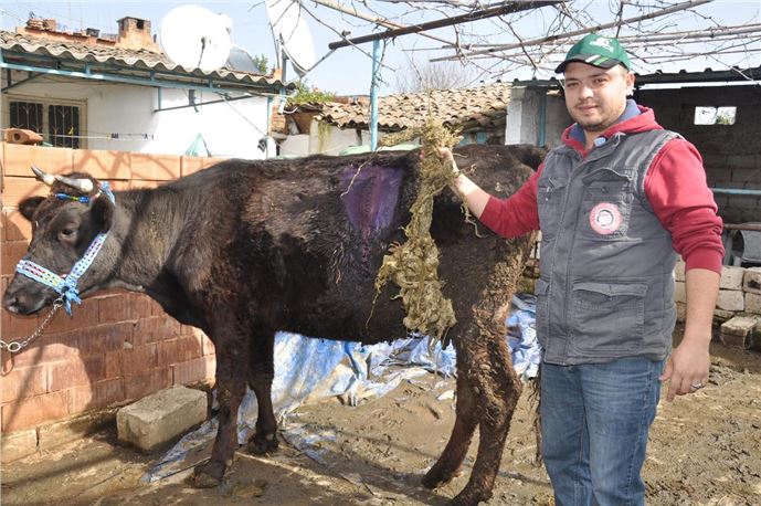 Aydın'ın Efeler İlçesi Kızılcaköy Mahallesi'nde Cevdet Erdem'e ait 4 yaşında 2 aylık gebe ineğin karnından 3 saatlik ameliyatla 2 kilo ağırlığında halat ve bir adet büyük çivi çıkarılarak hayvan sağlığına kavuşturuldu.Muhabir: Necip UYANIK