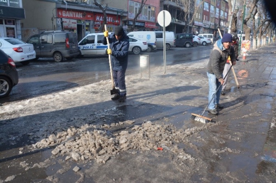 Kars Belediyesi kent merkezinde kar yağışının durmasının ardından cadde ve sokaklarda birken kar ve buz temizlenme seferberliği başlattı.
