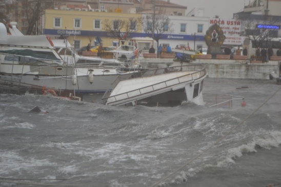 Dün geceden itibaren şiddetini arttıran fırtına, çatıların ve kiremitlerin uçmasına, ağaçları devirip, elektrik tellerinin kopmasına neden oldu. Bu arada, iç limanda bağlı bulunan balıkçı teknelerin 2 tanesi parçalanarak battı. Fırtına nedeniyle Gazi Süleyman Paşa Mahallesi’ndeki bir kapalı halı sahanın örtüleri parçalanarak, kullanılamaz hale geldi. Bazı esnaflarda fırtına nedeniyle, iskele kenarındaki büfelerinin uçmaması için, büfelerini iplerle bağladılar. Bir kayık ise, sahibi tarafından vinçle çıkarılarak, batmaktan kurtarıldı.