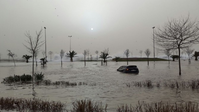 Pendik’te lodosun etkisiyle taşan deniz, karayla birleşti. Seyir halindeki araçlar su altında kalırken bir otomobil de yan yattı.