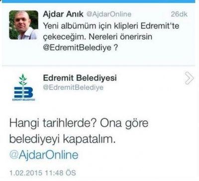 Twitter hesabı üzerinden Edremit Belediyesi’nden, yeni çıkaracağı albümün klibi için yardım isteyen Ajdar, hiç beklemediği bir cevap aldı. Twitter hesabı üzerinden Edremit Belediyesi’ne "Yeni albümüm için klipleri Edremit’te çekeceğim nereleri önerirsin @EdremitBelediye?" diyen Ajdar’a belediyenin resmi hesabından, "Hangi tarihlerde? Ona göre belediyeyi kapatalım" cevabı geldi. Belediyenin verdiği bu cevap bir çok kullanıcı tarafından sosyal medyadan paylaşıldı. Bu mesajın ardından sessizliğini bozan Ajdar, "Edremit Belediyesi’nin attığı bu twit sanatçıya verilen değeri göstermektedir. Sizi fanlarıma havale ediyorum” dedi.