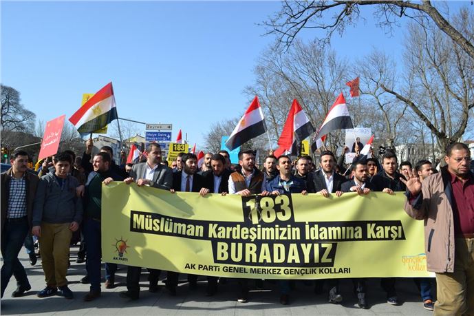 AK Parti Gençlik Kolları, Mısır'da darbe karşıtı 183 sanığa verilen idam kararını protesto etti. Fatih Camisi'nde cuma namazının ardından toplanan grup, ellerinde Rabia ve Mısır bayrakları taşıyarak ve tekbir getirerek Saraçhane Parkı'na yürüdü.Muhabir: Lale Bildirici