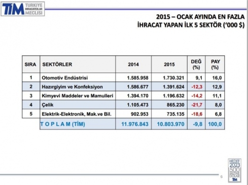 Türkiye İhracatçılar Meclisi (TİM) Ocak ayı ihracat rakamlarını açıkladı. Açıklamaya göre Ocak ayında Türkiye’nin ihracatı geçen yılın aynı ayına göre yüzde 9,8 düşüşle 10 milyar 804 milyon dolar olurken son 12 aylık ihracat ise yüzde 2,5 artışla 156 milyar 118 milyon dolar olarak gerçekleşti. İhracat rakamlarını sosyal medya hesabı (twitter) üzerinden değerlendiren Sakarya Ticaret ve Sanayi Odası Yönetim Kurulu Başkanı Mahmut Kösemusul, düşüşün nedenlerine değinerek otomotiv endüstrisinin başarısına dikkat çekti. Başkan Kösemusul, “TİM, Ocak ihracat verilerini açıkladı. İhracatımızda düşüş (-%9,8) var. Genel ihracat, 10 milyar 804 milyon dolar. Mevsim koşulları, eksik iş günü ve paritede yaşanan gerilemenin ihracatımızdaki düşüşte etkisi olduğu görülüyor. İhracatımızda Otomotiv Endüstrisinin ağırlığı devam ediyor. Otomotivin Ocak ayı genel ihracatında 1 milyar 730 milyon dolarlık bir payı var. Sakarya’mız, Ocak ihracat sıralamasında, 178 milyon 78 bin dolar (-%18,7) ihracatıyla, 9. il olarak yer alıyor. Sakarya’mız ve ülkemiz ihracatına katkı veren iş dünyamızı kutluyor, başarıların artarak sürmesini diliyorum. İnşallah bu düşüş devam etmeyecek, gayretimiz daha da artacak ve ihracat hedefimize ulaşacağız” ifadelerini kullandı.