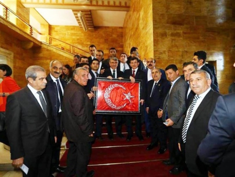 Şanlıurfa’da mağduriyetleri giderilen Köylere Hizmet Götürme Birliği personelleri, Başbakan Ahmet Davutoğlu’na Osmanlıca işlemeli Türk bayrağı tablosu hediye etti.