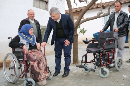 Saruhanlı Belediye Başkanı Hüseyin Yaralı, yaklaşık 45 yıl önce ağaçtan düşmesi sonucunda tekerlekli sandalyeye mahkum olan Hatice Sarı’ya (63) akülü araba hediye etti.