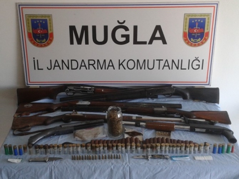 Edinilen bilgiye göre; Muğla İl jandarma komutanlığı narkotik ekipleri, ihbar üzerine Marmaris merkezde K.S’ye ait bir ev ve işyeri ile 20 kilometre uzaklıktaki Hisarönü mahallesinde bir bağ evine operasyon düzenlendi. Bağ evinde yapılan aramada, 4 kilo uyuşturucu esrar maddesi, 9 adet ruhsatsız av tüfeği, 101 adet av tüfeği fişeği, 18 adet tabanca mermisi, 2 adet sustalı bıçak, 2 adet neşter ve 4 adet esrar içme aparatı ele geçirildi. Olayla ilgili K.S jandarma tarafından göz altına alındı. Zanlı jandarmadaki işlemlerinin ardından adliyeye sevk edildi.