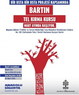 Proje kapsamında bu yıl açılacak kurslar, Ardahan’da ‘Damal Bebek Yapımı’, Aydın Söke’de ‘Körüklü Çizme Yapımı’, Bartın’da ‘Tel Kırma’, İstanbul’da ‘Kukla Yapımı’ ve Zonguldak Devrek’te ‘Baston Yapımı’ kursları olacağını bildiren İl Kültür ve Turizm Müdürü Fuat Dursun; 20-45 yaş arası bayanların kurslarımıza katılmasını ve kurs sonunda kursiyerlere avantaj sağlayacak birçok kolaylığında olacağını söyledi. Kurslara müracaat 10 Şubat-02 Mart 2015 tarihleri arasında kimlik fotokopisi ve 2 adet fotoğrafla, Bartın Kültür Merkezinde İl kültür ve Turizm Müdürlüğüne yapılacağını söyledi.