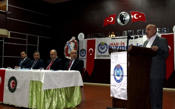 Genel kurulda konuşan Hak-İş Konfederasyonu ve Hizmet-İş Sendikası Genel Başkanı Mahmut Arslan, Hizmet-İş’in Adıyaman’da kurulduğunu ve şuan Türkiye’nin en önemli sivil toplum kuruluşları arasına girdiğini dile getirdi. Arslan, “Tarihi bir gün yaşıyoruz, gerçekten büyük bir onurla büyük bir gururla bu genel kurulu gerçekleştiriyoruz. Bunlardan bir tanesi 36 yıl önce bu topraklarda, bu belediyede başlayan Hak-İş’in Hizmet-İş Sendikasının kutlu yolculuğu bugün çok önemli bir aşamaya gelmiştir. Son 24 Ocak 2015 tarihinde yayınlanan istatistiklerde üye sayısını en fazla arttıran, Hak-İş’in en büyük sendikası, Türkiye’nin de en büyük sendikası olan Hizmet-İş Sendikasının tarihi başarısında buradan çıkan yolculuğun, mutlaka katkıları var.
