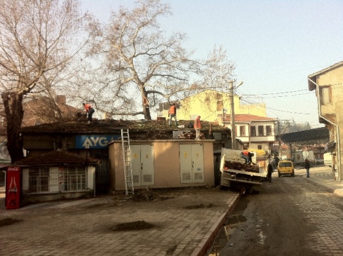 Belediye fen işlerine bağlı ekipler Emirler Caddesi başta olmak üzere Kemal Zeytinoğlu Caddesinde bulunan asırlık çınarlara vinç yardımıyla uzanıp kırılan dallarını topluyor. Çalışma esnasında güvenlik tedbiri alan işçilere çevrede ki vatandaşlarda yardımcı oluyor.(İÖ-EFE)