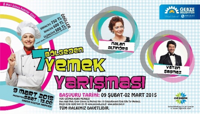 Gebze Belediyesi tarafından GKM’de düzenlenecek ‘7 Bölgeden Yemek Yarışması’na başvurular başladı. 9 Mart Pazartesi günü saat 13.00’de sunuculuğunu Vatan Şaşmaz’ın üstleneceği ve Türk Sanat Müziği Sanatçısı Nalan Altınörs’ün de mini bir konser vereceği yemek yarışmasına katılmak isteyen Gebzeli kadınlar, 9 Şubat-2 Mart tarihleri arasında başvuruda bulunabilecekler. Hacı Halil Mahallesi Eyüp Güvenç İş Merkezi No: 15 adresinde bulunan GESMEK Merkezi’ne başvuruda bulunabilecek Gebzeli hanımlar yarışmaya dair bilgileri 0 262 644 33 78 numaralı telefonu arayarak alabilecek.