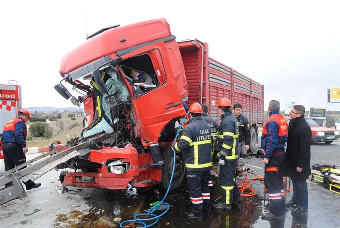 Uşak'ta önünde ilerleyen tıra arkadan çarpan tırın sürücüsü Yüksel Dinç araç içinde sıkıştı. İtfaiye ekipleri uzun uğraşların ardından sürücüyü sıkıştığı yerden çıkarmayı başardı.Muhabir: Soner Kılınç