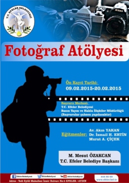 İlçede fotoğrafçılığa merak saranlara yönelik açacakları kursa kontenjana göre kursiyer alınacağına dikkat çeken Efeler Belediye Başkanı M. Mesut Özakcan, "Fotoğraf kursumuza 25 Şubat 2015 tarihinde başlayacak olup, 15 Nisan 2015 tarihinde sona erecektir. Çalışmalar her hafta Çarşamba günleri saat 19.00 - 21.00 saatleri arasında Efeler Belediyesi ana binada yapılacaktır. Kursumumuz birbirinden değerli eğitmenler, Av. Akın Yakan, Dr. İsmail H. Ertin ve Murat A. Çiçek tarafından verilecek olup, 9 Şubat ve 20 Şubat tarihleri arasında Efeler Belediyesi Basın Yayın ve Halkla İlişkiler Müdürlüğü’ne şahsen yapılacaktır" dedi.